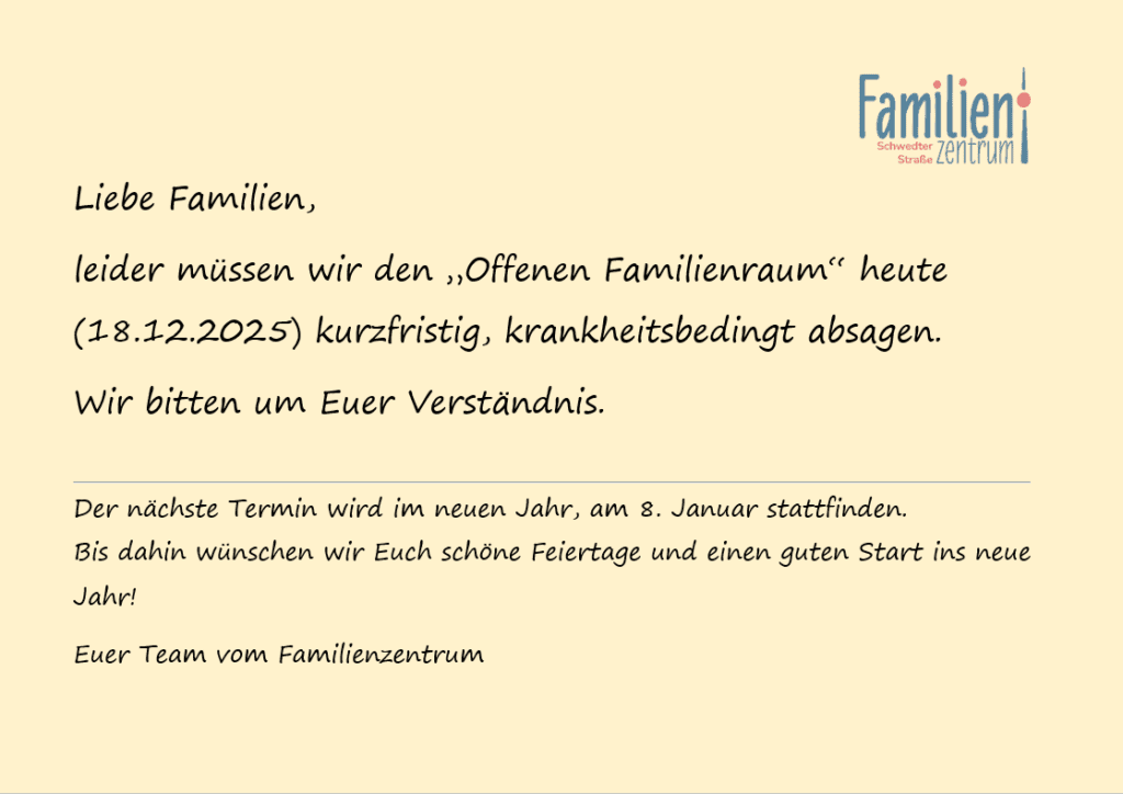 Liebe Familien, leider müssen wir den „Offenen Familienraum“ am 4.9.25 kurzfristig absagen. Der nächste Termin für den „Offenen Familienraum“ ist am 11.9.25. Euer FZ-Team