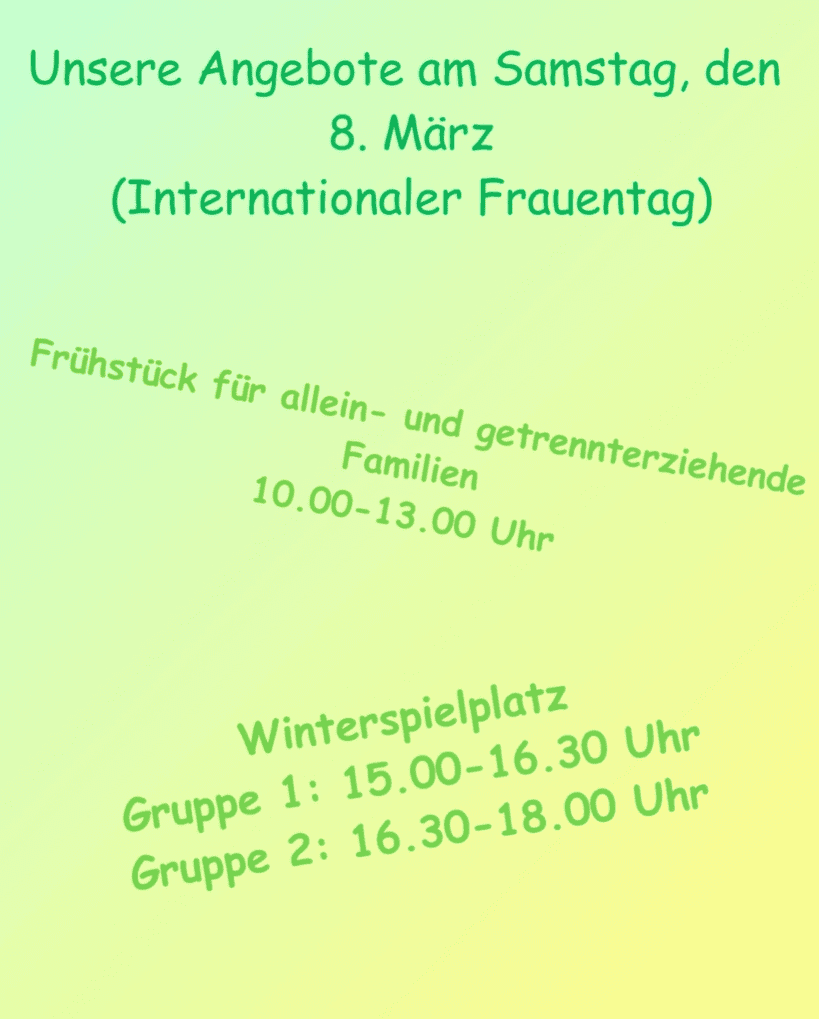 Liebe Familien, unsere Angebote, das Samstagsfrühstück und auch der Winterspielplatz finden trotz des Feiertags zu den gewohnten Zeiten statt.