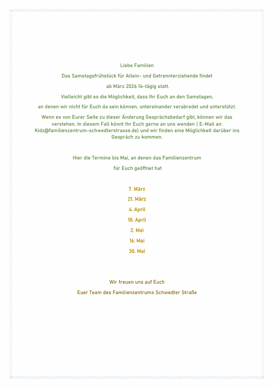 Liebe Familien, wir müssen das Frühstück für kommenden Samstag aus personellen Gründen leider kurzfristig absagen. Es tut uns leid! Das nächste Frühstück für allein- und getrennterziehende Familien findet am 5. […]