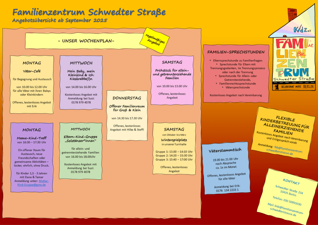 Seit Januar 2021 gibt es uns in der Schwedter Straße 234. Wir sind ein Ort, an dem die Bedürfnisse von Klein und Groß gleichermaßen gesehen werden. Bei uns steht die Begegnung von Menschen im Vordergrund. Verbindung stärken, Erfahrungen austauschen und teilen, Spielen, Bewegen, Gestalten, Kaffee/Tee und Kekse in unserem schönen großen Garten, einfach nur mal Durchatmen, uns miteinander auf die Suche nach Lösungsmöglichkeiten für alltägliche Fragen sowie schwierige Lebenssituationen machen – all das und mehr begleitet durch unser multidisziplinäres Team.