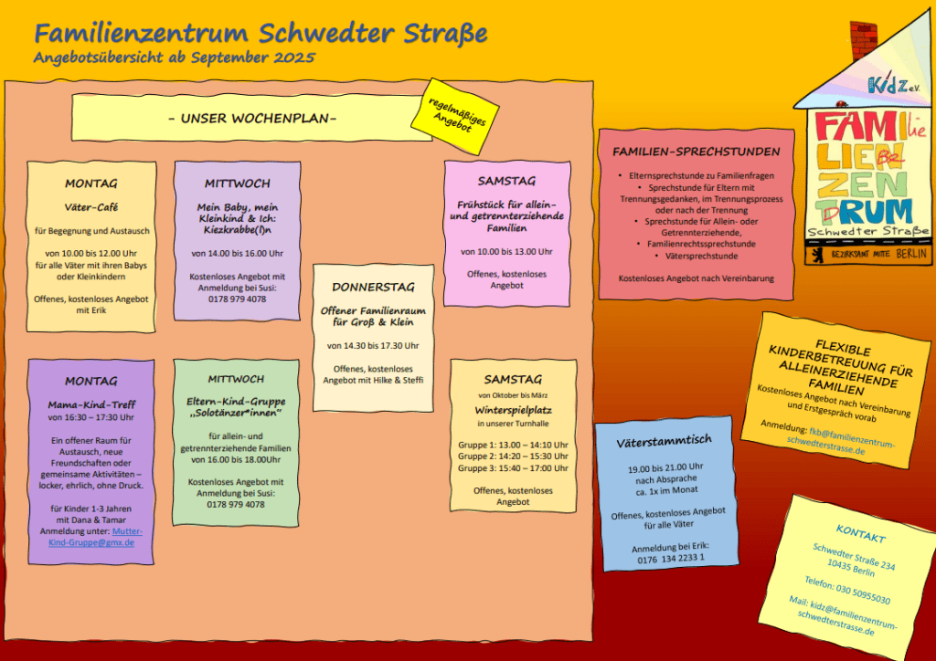 Seit Januar 2021 gibt es uns in der Schwedter Straße 234. Wir sind ein Ort, an dem die Bedürfnisse von Klein und Groß gleichermaßen gesehen werden. Bei uns steht die Begegnung von Menschen im Vordergrund. Verbindung stärken, Erfahrungen austauschen und teilen, Spielen, Bewegen, Gestalten, Kaffee/Tee und Kekse in unserem schönen großen Garten, einfach nur mal Durchatmen, uns miteinander auf die Suche nach Lösungsmöglichkeiten für alltägliche Fragen sowie schwierige Lebenssituationen machen – all das und mehr begleitet durch unser multidisziplinäres Team.